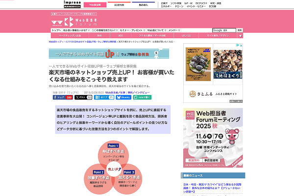 Impress「ネットショップ担当者フォーラム」に寄稿しました。楽天市場店舗の改善事例を題材に、離脱防⽌や導線改善、コンバージョン率向上施策を具体的に解説しました。この執筆を通じて、ECサイト改善の専⾨性が広く認知されました。