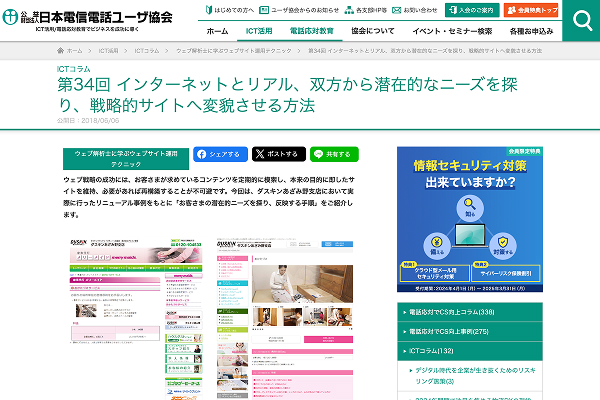 JTUA(⽇本テレフォニー‧ユーザ協会)の公式コラムに寄稿しました。「インターネットとリアルから潜在ニーズを探る戦略的サイト運営」をテーマに、Webとリアルの両⾯から顧客ニーズを探る重要性を提⾔しました。業界外の企業経営層にもWeb活⽤の可能性を伝える機会となりました。