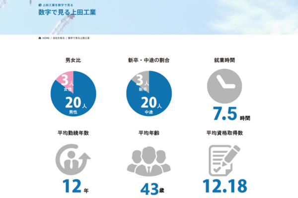 応募者が知りたい「中途採用の割合」「平均残業時間」「休日」「職種別の働き方」などを整理し、