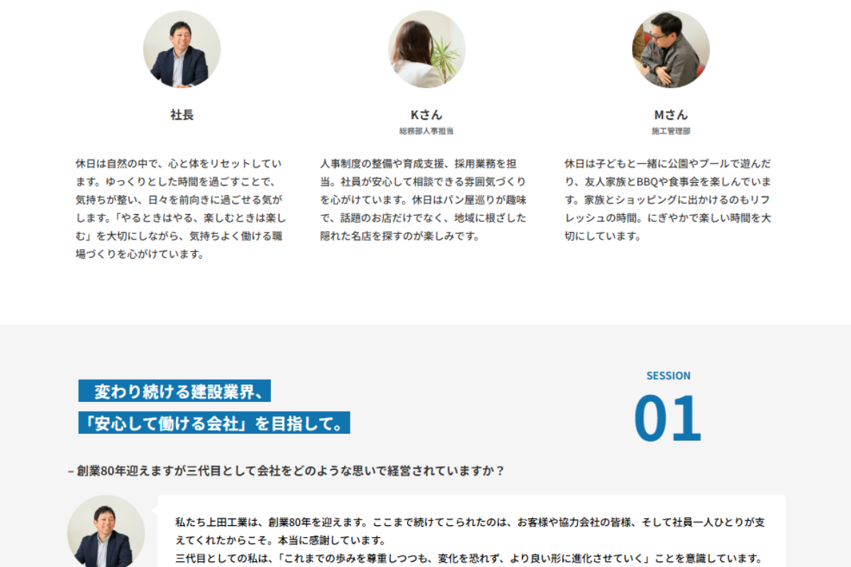 どんな人たちと、どんな場所で働くのかイメージしやすいように各ページへ配置し、応募前に会社との距離が少し縮まるよう意識しています。