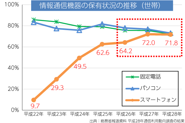 スマートフォンを保有する世帯の割合は71.8%となり、パソコンを保有する世帯の割合(73.0%)とは、ついに1.2ポイント差まで迫っています。