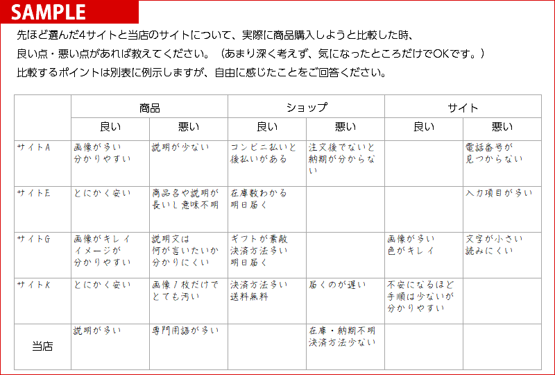 まずは簡単な調査で「お客様からみた自分のサイトの本当の強さと売り、他社と差別化をはかるべき点」を知ることから始めてみましょう。