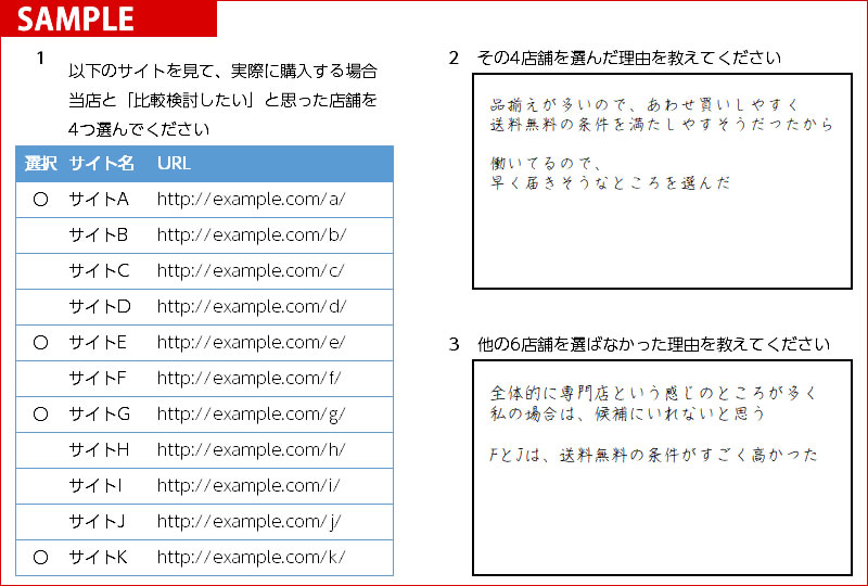 例えばECサイトであれば、商品・ショップ・サイトなど大きく3つ程度のポイントに分け、細かい比較ポイントは後述する項目から必要なものを例示するにとどめ、感じたことを自由に回答してもらうとよいでしょう。
