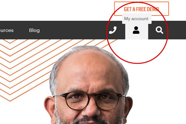 Magentoの公式サイトにアクセスし、画面右上の人型のアイコン「My account」をクリックします。