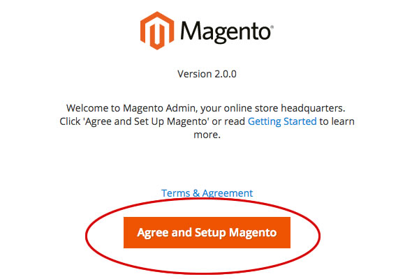インストールしたURLへアクセスし、<Agree and Setup Magento>をクリック