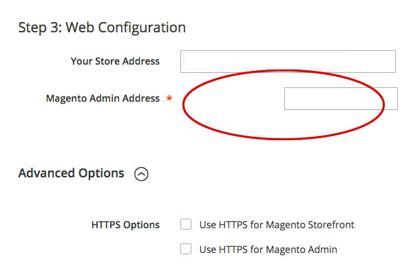 [Step 3:Web Configuration]ではショップや管理画面のURLを確認し、必要であればオプションを設定し、<Next>をクリックします。