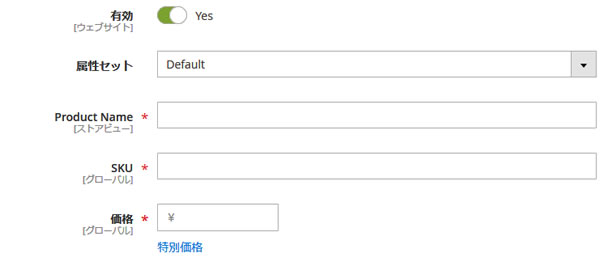 事前に用意しておいた属性セットを選択し、必須項目である「Product Name(商品名) / SKU(商品管理番号) / 価格」の3点を設定してください。