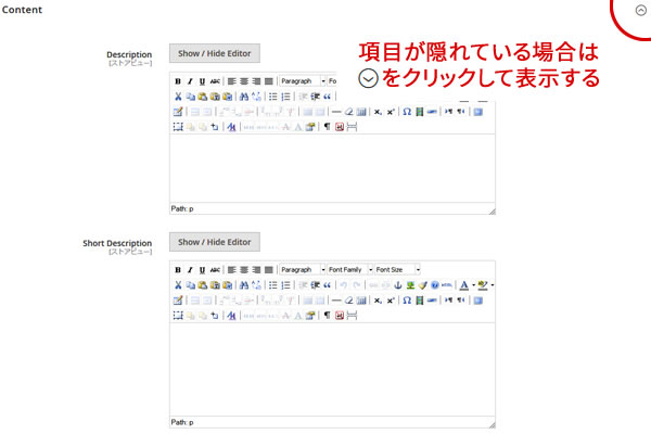 基本情報の下に「Content(商品説明)」や「画像とビデオ」「Search Engine Optimization」など付加情報を入力・設定する場所があります。