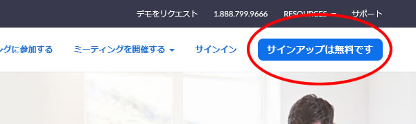 Zoomの公式サイトにアクセスし、画面右上の<サインアップは無料です>ボタンをクリックします。