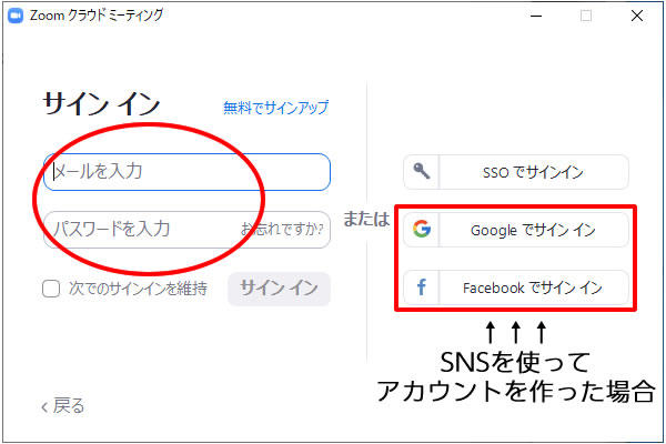[サインイン]画面が表示されたら、メールアドレスとパスワードを入力し、<サインイン>ボタンをクリックします。GoogleもしくはFacebookを経由してアカウントを作成した場合は、そちらのボタンをクリックしましょう。