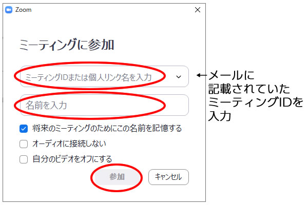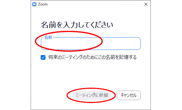自動的にアプリが起動すると、[名前を入力してください]という画面が表示されます。ここに入力した名前がミーティング中に表示されますので、漢字など、他の参加者に分かりやすい名前を入力しましょう。<ミーティングに参加>ボタンをクリックすると、ミーティングに参加できます。
