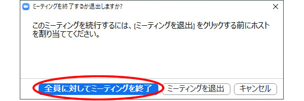 [ミーティングを終了するか退出しますか]という確認画面が表示されるので<全員に対してミーティングを終了>をクリックしましょう。(ミーティング中に、先に自分だけ退出する場合は、<ミーティングを退出>ボタンをクリックします。)