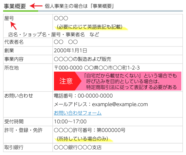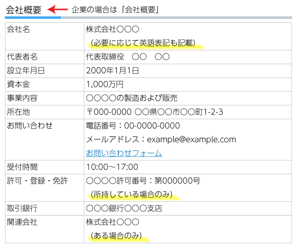 記載項目は会社の客観的な情報や事実ですので、トップページや商品紹介ページよりは簡単に作成できます。必ず作成するようにしましょう。