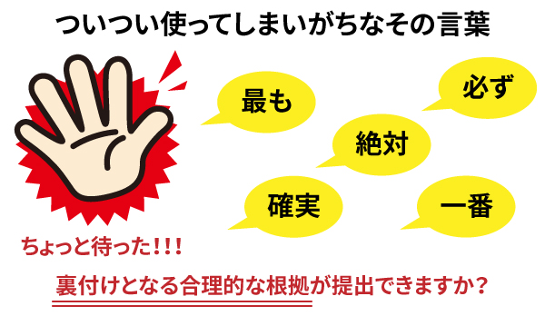 虚偽表示をうっかりやってしまう人は少ないでしょうが、怖いのが意図せぬ誇大表示です。特に「最も」「絶対」「確実」「一番」「必ず」などの、効果や性能を断定する言葉を使用する際は、客観的に実証された裏付けデータがあるか確認しましょう。