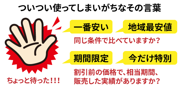 特に「割引」「期間限定」などの言葉は、割引前の価格で販売した実績があるか、期間はいつまでかを確認したうえで使いましょう。