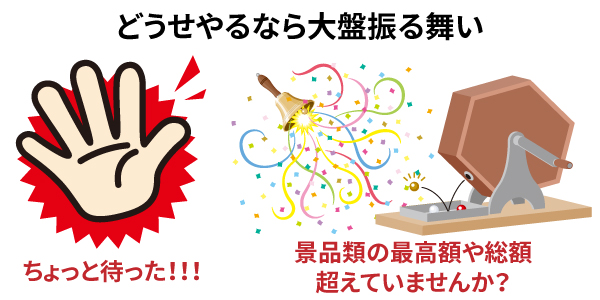 例えば、人気のショッピングモールにてセール期間中にくじ引きを設けるとします。期間中の売上予定総額はかなり高額になるでしょうが、景品の最高額は30万円までです。