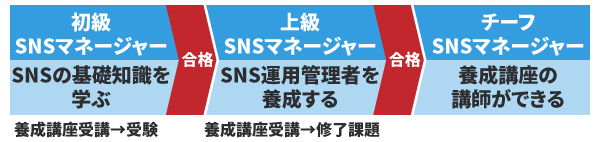 一般社団法人ウェブ解析士協会の認定資格です。企業SNSの運用から危機管理まで、包括的に管理できる人材の育成が目的とされています。初級・上級・チーフの3クラスがあり、それぞれ養成講座を受講し試験に合格すると、認定書が発行されます。下級から順に合格する必要があり、上級やチーフをいきなり受講・受験することはできません。