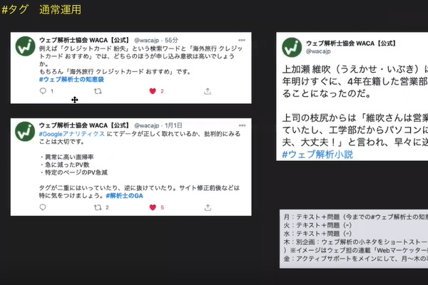 そこで「目立たないように埋もれさせてしまおう」と考え、1日7ツイート程度を確保することにしました。イベント情報などが1日2ツイート弱あるため、残りの5ツイートをウェブ解析士のノウハウを紹介する内容とし、量と質の両面から充実させたのです。これにより「こういうことをやっている協会ですよ」と分かりやすく、ガラリとイメージも変えることに成功しました。