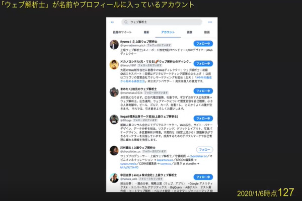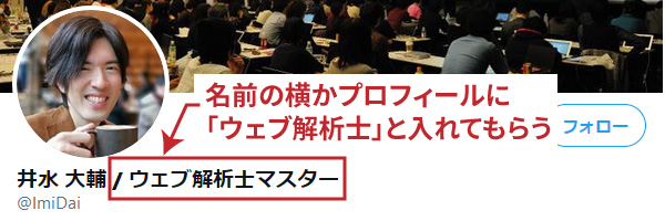 しかし現在1万人ぐらいいるウェブ解析士が、情報発信してくれれば一気にリーチが広がります。わざわざ「私はウェブ解析士です」と言わなくても名前の横に「ウェブ解析士」と書いてあれば、その人がどんなツイートしても表示されます。名前の横のハードルが高ければ、プロフィールでもよいわけです。その方を通じて認知は広がっていきます。