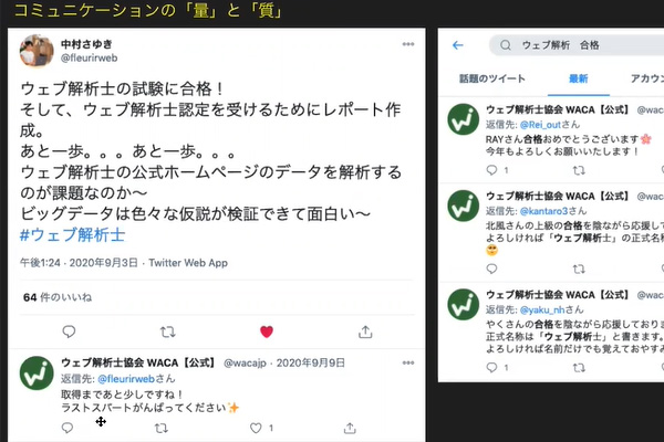質をあげるためには、試験合格者への対応を行いました。「ウェブ解析士 合格」で検索し、合格したことをツイートしている人には、「いいね」だけでなく、協会としてのコメントを入れています。