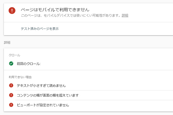 モバイルフレンドリーテストで不合格の場合(問題点がある場合)は、次のような画面でエラーが表示されます。