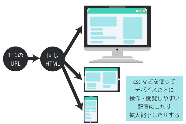 Googleが推奨しているスマホ対応の方法です。どんなデバイスをユーザーが利用していても、同じHTMLで同じURLにアクセスし、デバイスに適した方法で情報を見せることで操作・閲覧しやすいホームぺージを表示します。ホームぺージを表示範囲にあわせることから、スクリーン適応型といわれることもあります。