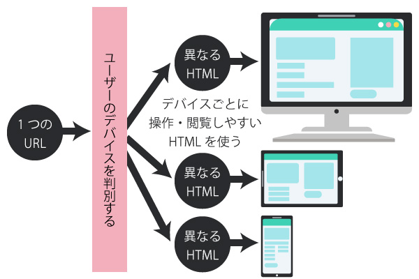 こちらもURLが一つなので、Googleが推奨しているスマホ対応の方法です。URLにアクセスした際、その方がどんなデバイスや環境を利用しているか判断してからそれぞれに適切なHTMLを表示します。例えばパソコン利用者にはパソコン用ホームページ、スマホ利用者にはスマホ用ホームページなど、それぞれのデバイスに用意された異なるHTMLで同じURLにアクセスします。