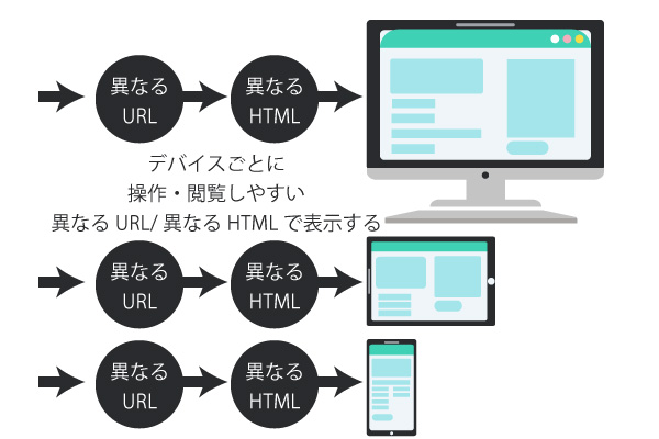デバイスごとに異なるURLを用意し、それぞれのデバイスや環境用に用意されたHTMLコードを利用したホームページを表示します。異なるHTMLでそれぞれ異なるURLにアクセスするわけです。こちらも、パソコン用とスマホ用のホームぺージをそれぞれ作成・制作するので、新規作成・制作・運営・管理それぞれに手間がかかります。同じ情報に対し複数のURLが存在するので、alternateやcanonicalを使い、URLを正規化する必要もあります。しかし他のデバイスのことを考えずに修正できる気楽さはあるでしょう。