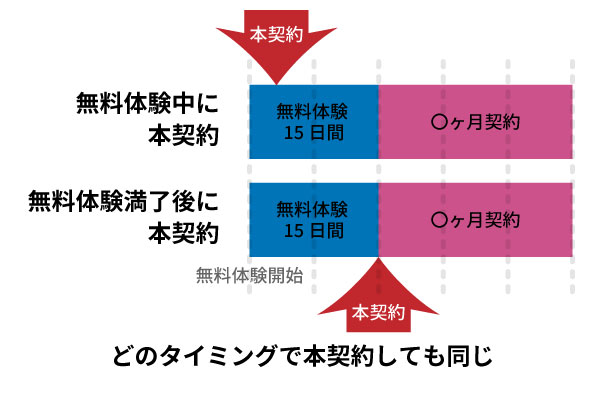 無料体験期間中に作成した設定やデータは、契約後もそのまま利用できるので安心です。また無料体験期間中に本契約しても無料体験期間は短縮されず、無料体験期間満了後に本契約期間が開始されます。