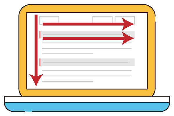 国語の教科書を想像してみてください。画面の右上から右下に向かって垂直方向に読んだ後、左上に戻り、そこからまた垂直方向に情報を確認していくレイアウトパターンです。視線が「N」という文字を描くように動くよう誘導することから、N型と呼ばれます。
