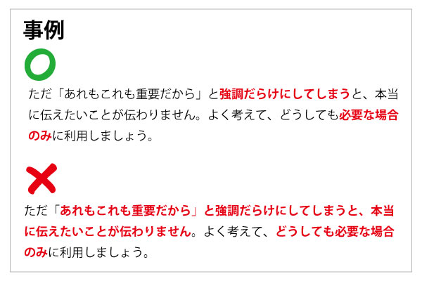 ただ「あれもこれも重要だから」と強調だらけにしてしまうと、本当に伝えたいことが伝わりません。よく考えて、どうしても必要な場合のみに利用しましょう。
