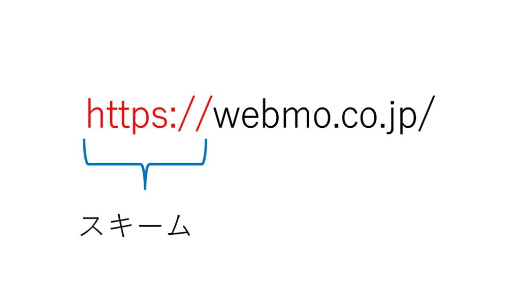 誰もが目にしたことがある「https://webmo.co.jp/」の赤字部分は「スキーム」と言い、「://」以前の部分のルールに従った上で通信をする、という判断をするために必要な役割を果たします。