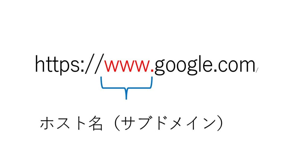 ホームページによっては、例えばグーグルのホームページアドレス「https://www.google.com/」のように、スキームの後に「www.」の表示があるものがあります。この「www.」の部分は「ホスト名」または「サブドメイン」と呼ばれます。