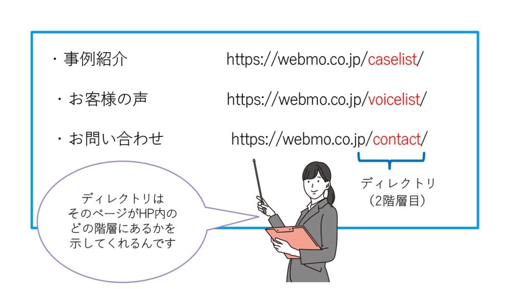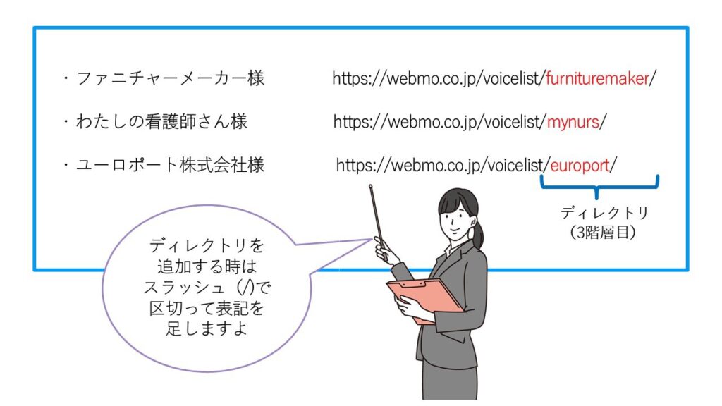 先ほどの「お客様の声」(2階層目)「https://webmo.co.jp/voicelist/」から、次の階層(3階層目)に当たる各お客様のページを閲覧する場合を例にあげると、以下の赤字の部分がディレクトリ階層の追加された部分に当たります。