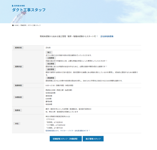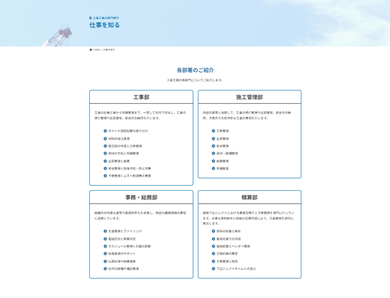 さらに、具体的な業務内容をより深く理解してもらうために社内の部署や職種紹介を掲載すると効果的です。特に専門性の高い業界では、業界外からの転職者でも容易に業務内容がイメージできるよう、以下の事例のように部署ごとに整理して紹介するのもおすすめです。