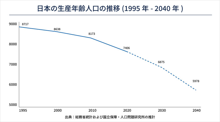 人口問題研究所の推計によると、2020年に約7,400万人だった生産年齢人口は、2040年には約5,900万人にまで減少すると予測されています。