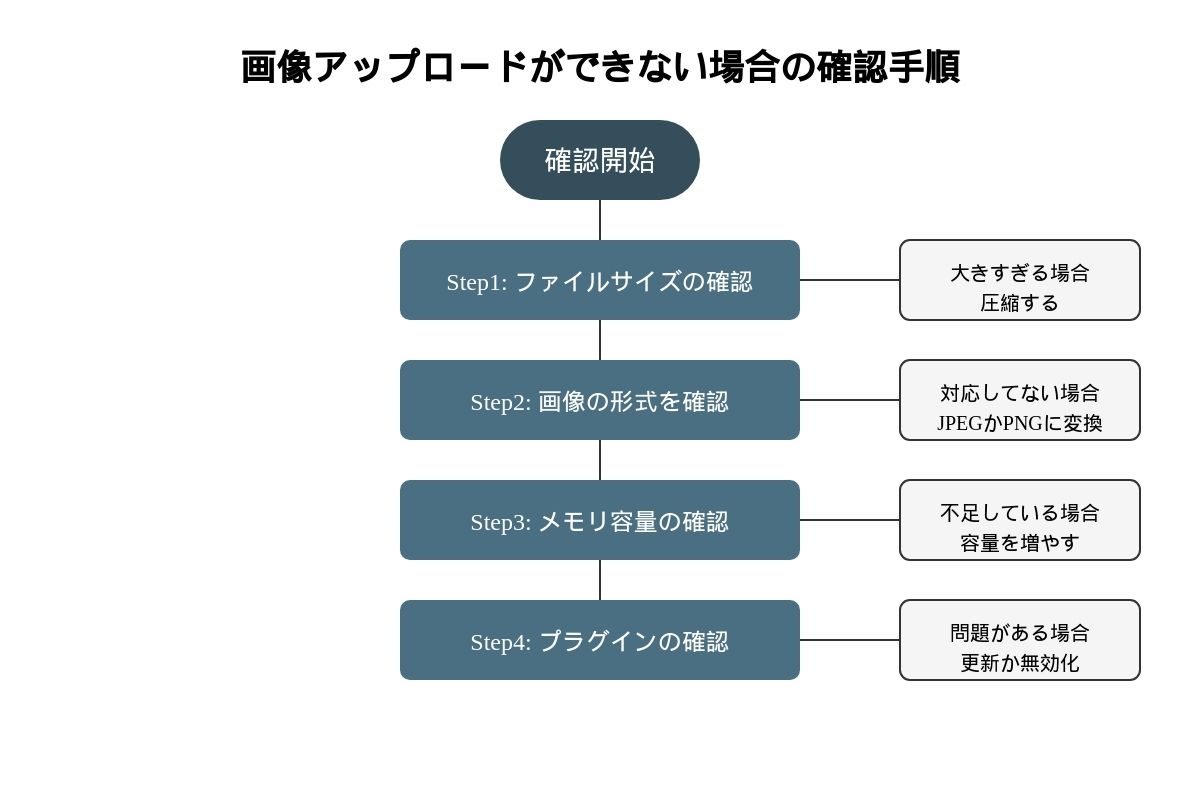 ここからは、いよいよ画像アップロードができない原因に対してどのように対策をすればいいのか、一つずつご紹介します。