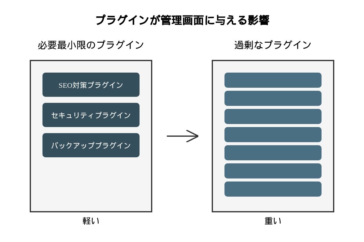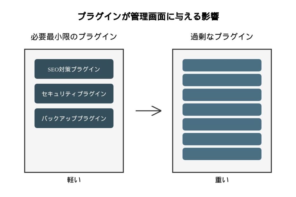 プラグインは管理画面のバックグラウンドで処理を行っているため、不要なものなどが多くインストールされてしまっていたり、負荷の大きいプラグインを有効化していたりすると、それだけで管理画面の読み込みが遅くなってしまうことがあります。